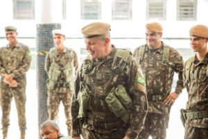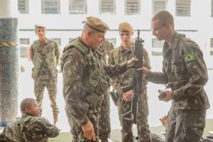 O Comandante do Exército verificou as atividades de preparação dos recrutas durante o período de Instrução Individual Básica (IIB), especificamente no manuseio do armamento, interagindo com os Soldados recém incorporados.